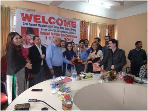 | IQAC of the Govt. MAM College organized Inter College “3rd Annual Maulana Abul Kalam Azad Rolling Trophy Symposium Contest to celebrate National Education Day on 11th Nov”. 2017. The programme commenced with the lighting of traditional lamp and floral tributes to Maulana Abul Kalam Azad, the first Education Minister of Independent India.Students besides city colleges presented their views from GDC Kilhotrian, Thannamandi, Mendhar, Billawar, Gool etc. Prof. Anju Bhasin Hon’ble Vice Chancellor of the Cluster University of Jammu was Chief Guest on the occasion. In her address she shared with the students the importance of National Education Policy in relevance with the developing digital world. She appreciated the efforts of the IQAC team for organizing this academic programme of current relevance. Ms. Seerat Baji of GCW Gandhi Nagar, Mehula Khajuria of GCET jammu and Mr. Danish Bashir of GDC Thannamandi Rajouri were adjusted 1st ,2nd and 3rd respectively by the jury member consisting of Prof. Vijay Kotwal, Prof. Mohd. Assadullah Wani both former Principal and Dr. Ashok Gupta of Department of Hindi,University of Jammu.The welcome address was presented by Dr. Ajeet Angral Principal of the College who advised the students to participate in such type of competitions to keep the contribution of Maulana Abul Kalam Azad relevant. The significance of the function is more relevant in this College since it has been named after theMaulana Abul Kalam Azad first Education Minister of Independent India. Vote of thanks was presented by Dr.Rakesh Kumar koul Coordinator IQAC. The comparing of programme was done by Ms.Manya Langar and Ms.Ujala Mahajan.Others who coordinated were IQAC team namely Dr. Muneer Hussain, Dr. Joginder, Dr. Apfan Ali (Coordinator Coordination Committee), Dr. Mateen , Dr. Sajjad, Dr. Ridhi Shrama, Prof. Rakesh Sharma, Dr. Shahnawaz Parven, Prof. Monika Mahajan, Prof. Bhanu Priya.Dr. Ashfaq, Dr. Kuldeep Singh, Mr. Ranjan Singh. Dr. Geetanjali Andotra Dean Arts, Cluister University of Jammu and Dr. Twinkle Suri Dean Student Welfare, Prof. Renu Bala Nanda, Prof. Nalini Pathania and Prof. Anoop graced the occasion. |