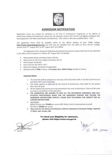 | Application Forms are invited for admission to 05 Year B. Architecture Programme to be offered at Government School of Architecture,Jammu for the Academic session 2017-18 from all eligible candidates who have appeared in JEE Main Examination (Architecture)-2017 and/or who have qualified NATA-2017 |
